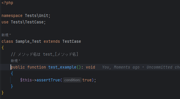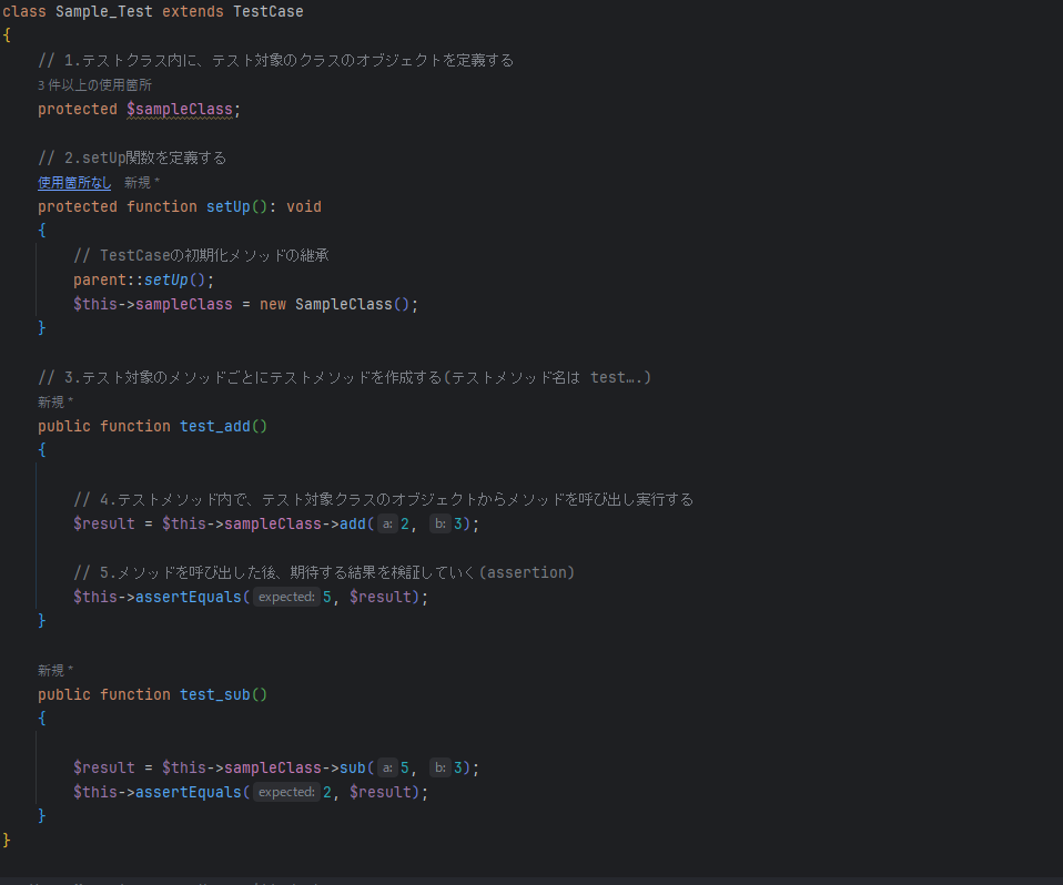 これら1~5の内容をテストコード(Sample_Test.php)に追加すると以下のようになります。