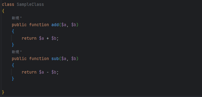 次にテスト対象として、足し算、引き算の機能を持つクラス(SampleClass.php)を作成します。