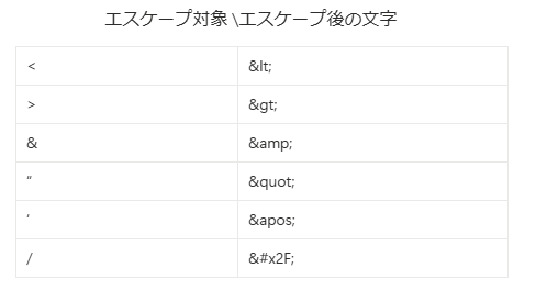エスケープ処理とは、 <script>のようなウェブページの表示に影響する特別な記号文字を無害な文字(HTMLエンティティ)に置き換えることです。