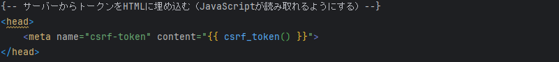 まず以下のようにBladeのheadタグ内にmataタグを用いてCSRFトークンを埋め込みます。