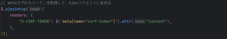 次にJavaScriptのjQuery.ajaxSetupメソッドに以下の記述を追加することで、metaタグからCSRFトークンを取得して、Ajaxリクエストに含めることができます。